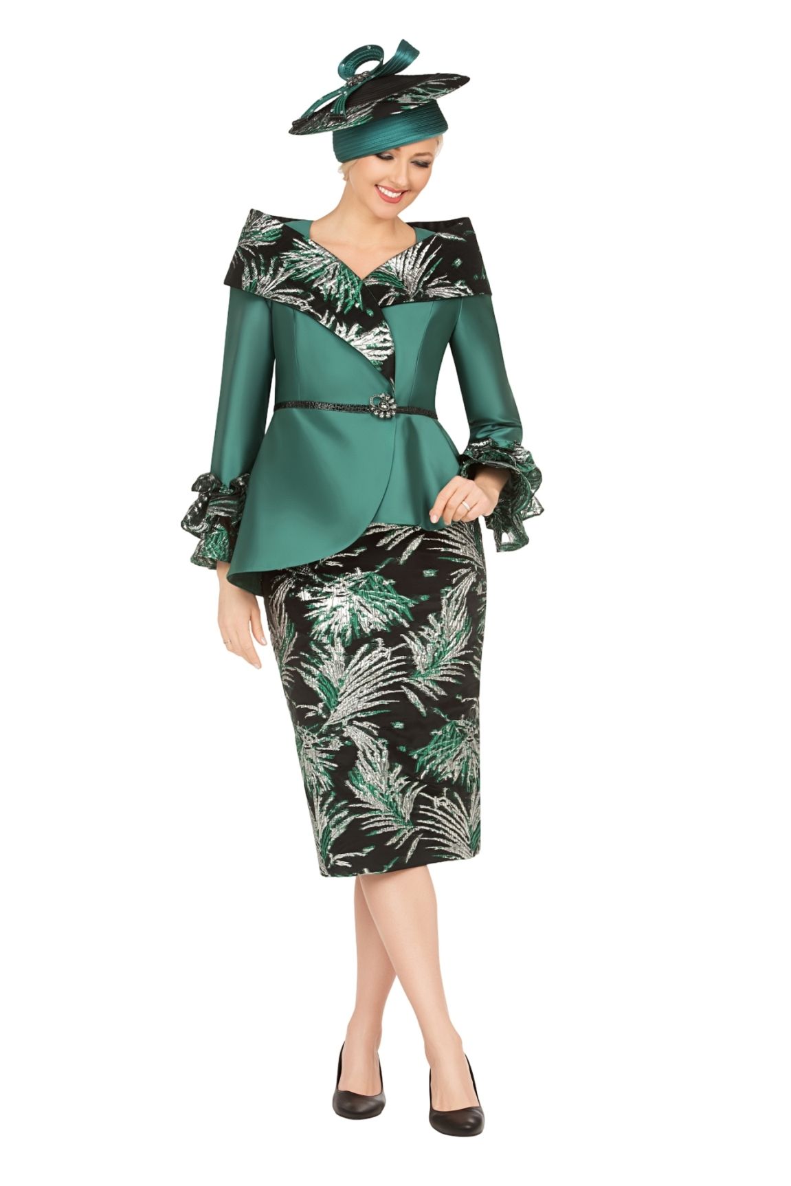 Description: 2pc Silky Twill & Jacquard Combo Skirt Suit