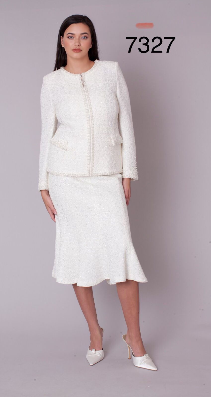 Description: Pearl Trim Tweed Skirt Suit w/Tailored Jacket & Flared Skirt