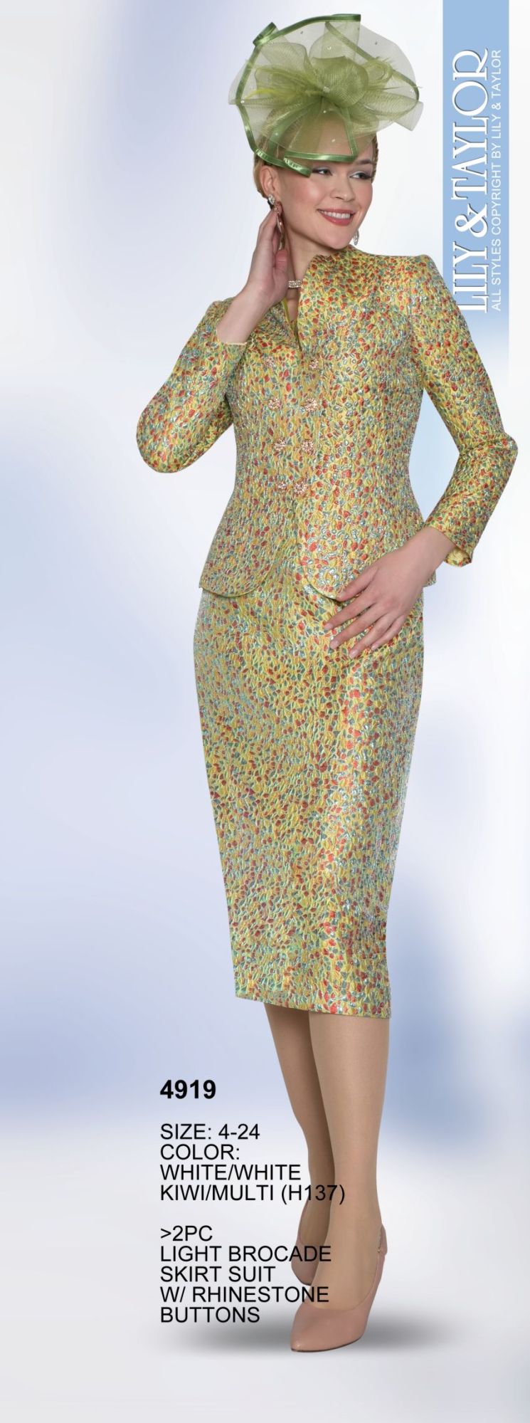 2PC Light Brocade Skirt Suit w/ Rhinestone Buttons