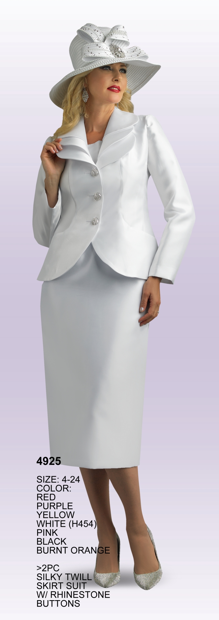 Description: 2 Piece Silky Twill Skirt Suit w/Rhinestone Buttons