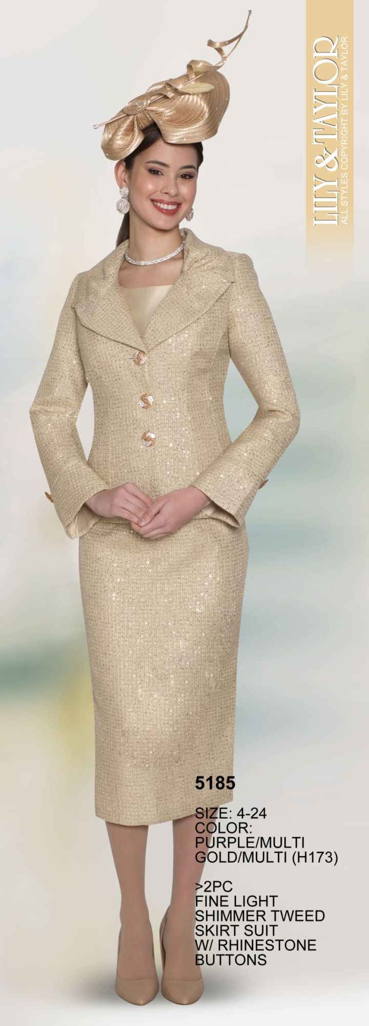Description: 2PC Fine Light Shimmer Tweed Skirt Suit with Rhinestone Buttons