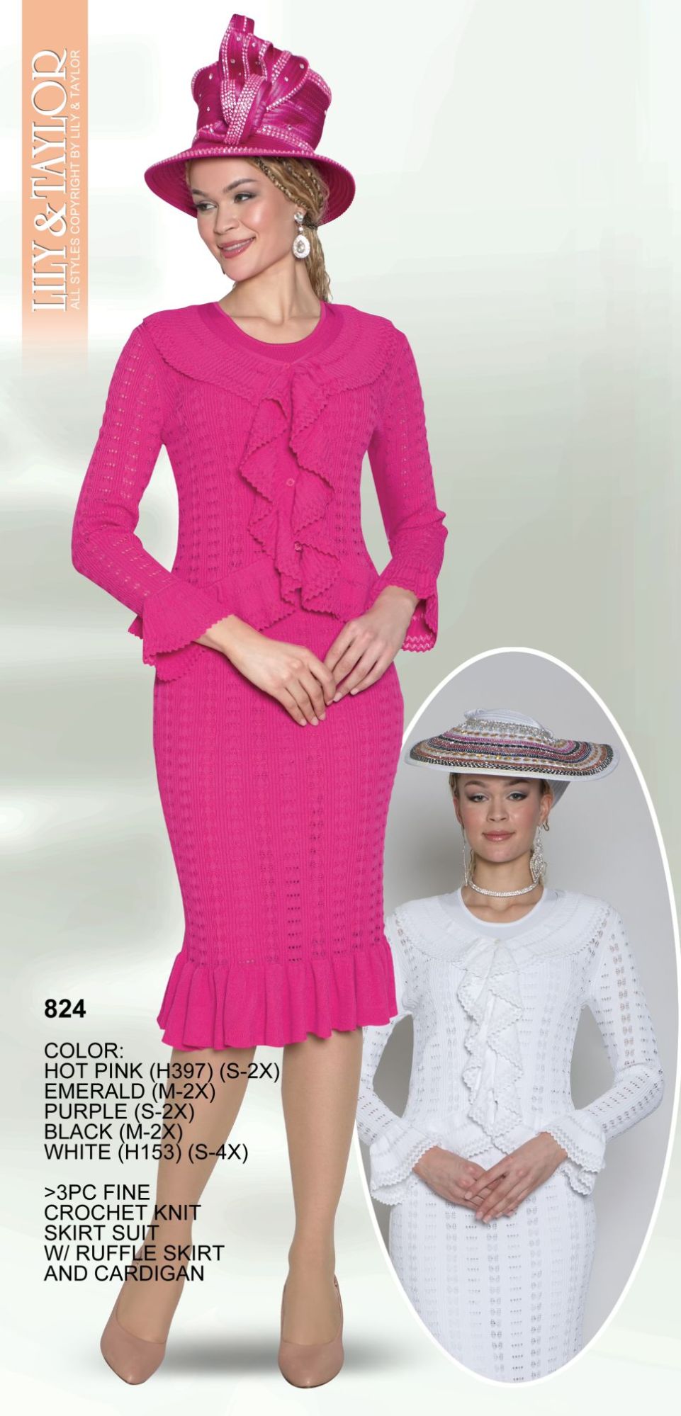 Description: 3PC FINE CROCHET KNIT SKIRT SUIT W/ RUFFLE SKIRT AND CARDIGAN