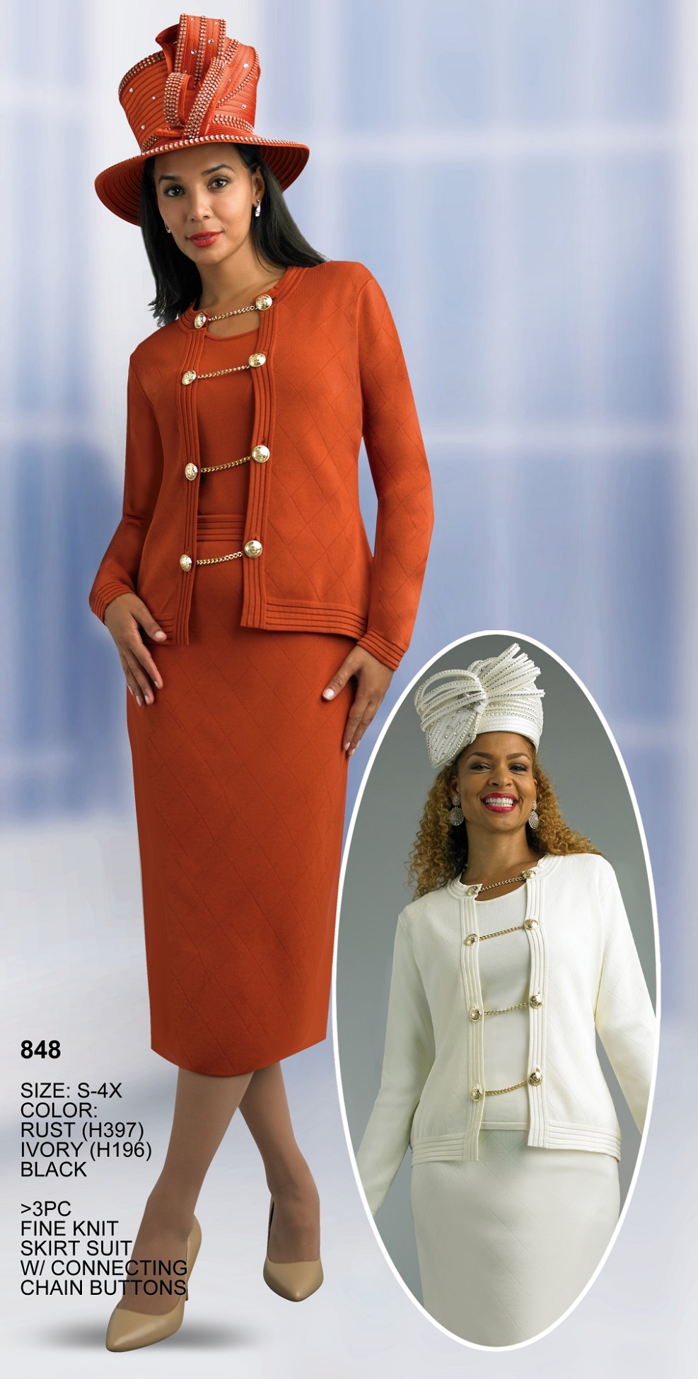 3 Piece Fine Knit Skirt Suit w/Connecting Chain Buttons