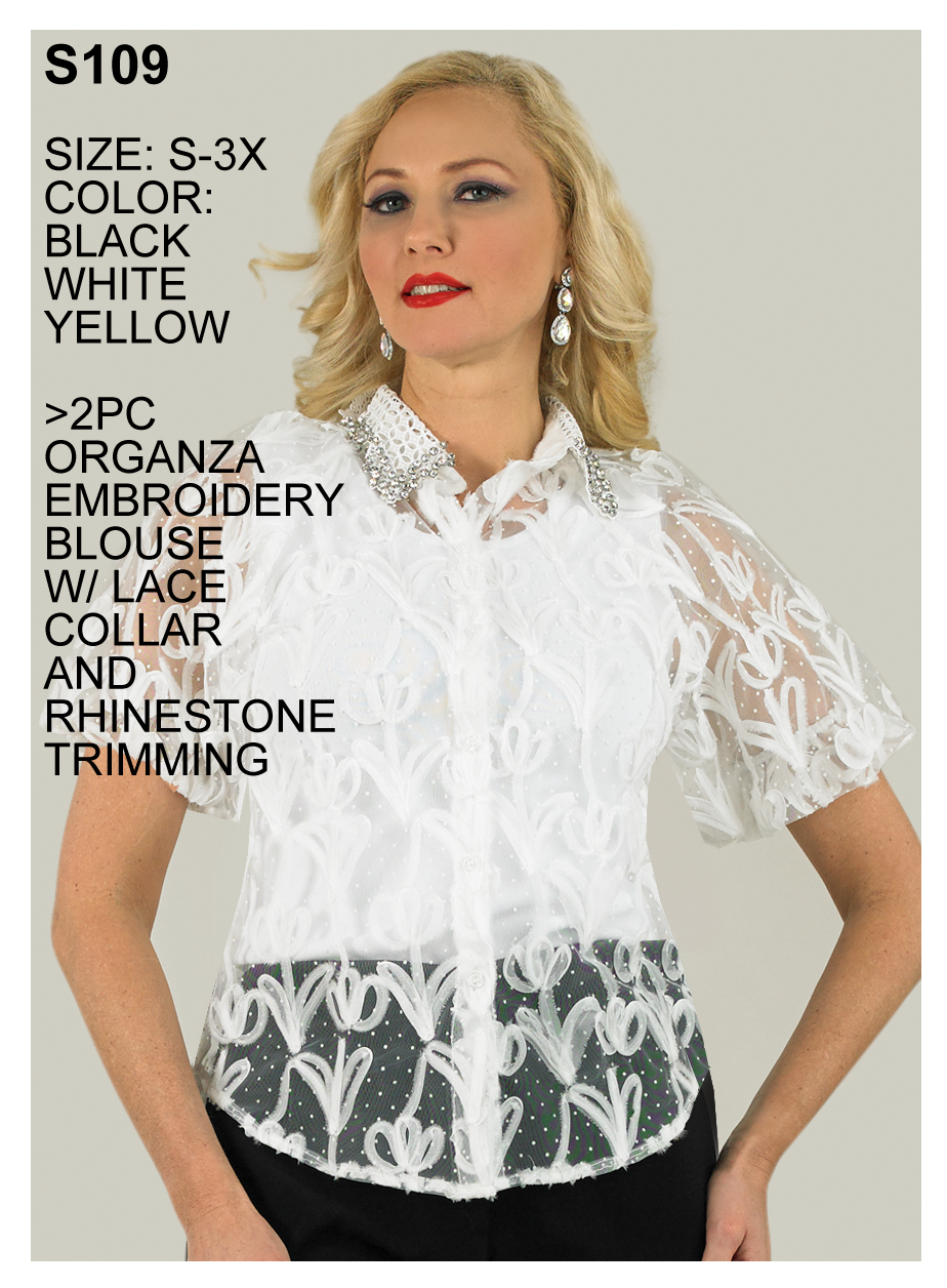 Description: 2 Pc. Organza Embroidered Blouse w/Lace Collar & Rhinstone Trimming