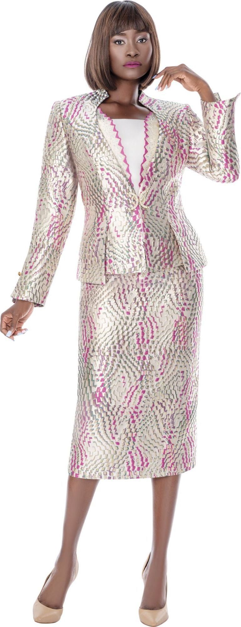 Description: 3 Piece Skirt Suit Jacquard with Rhinestones Embellishment & Rhinestone Clasp Closure