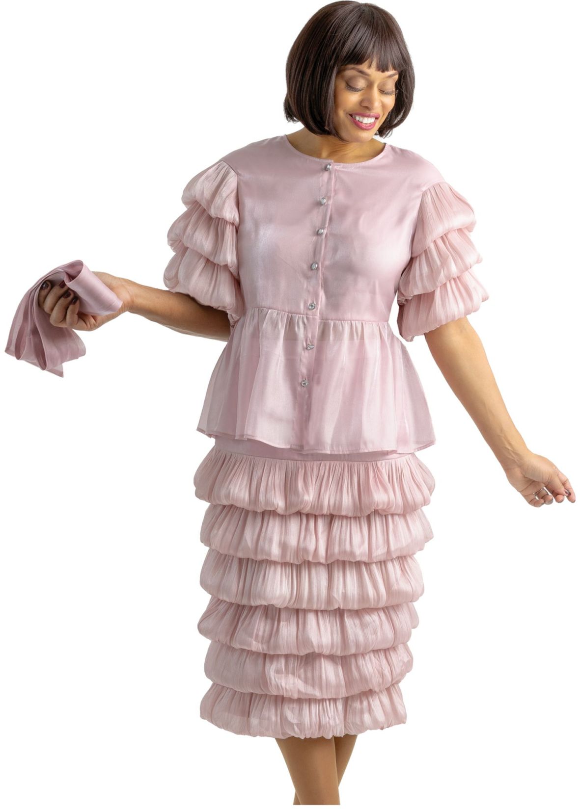 Tiered skirt set with peplum short sleeve blouse and rhinestone buttons