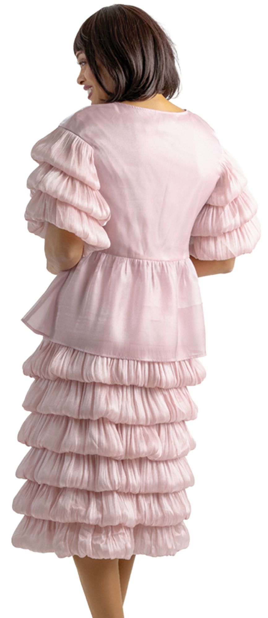 Desription: Tiered skirt set with peplum short sleeve blouse and rhinestone buttons