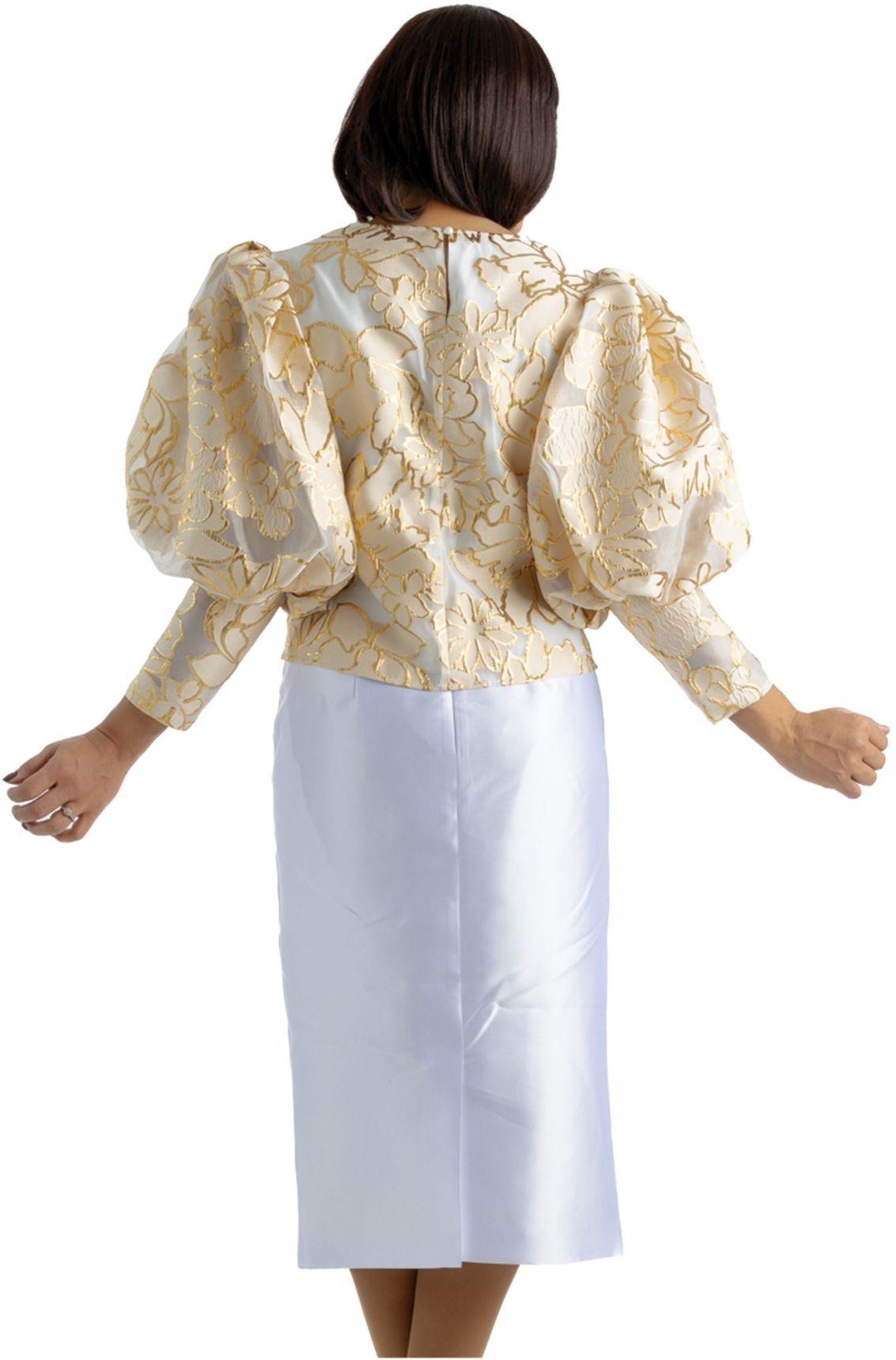 Skirt set with gold flower mutton sleeve top and gold embroidered skirt