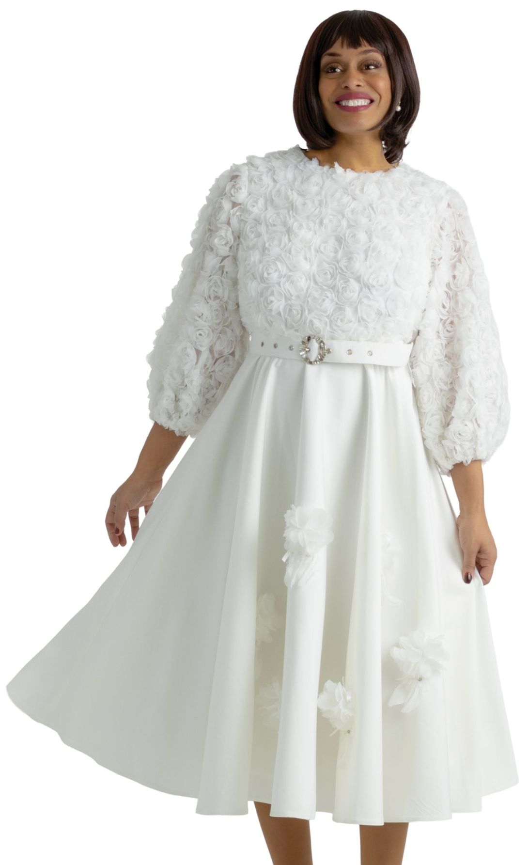 Desription: 3D flowers midi dress with balloon sleeves and belt
