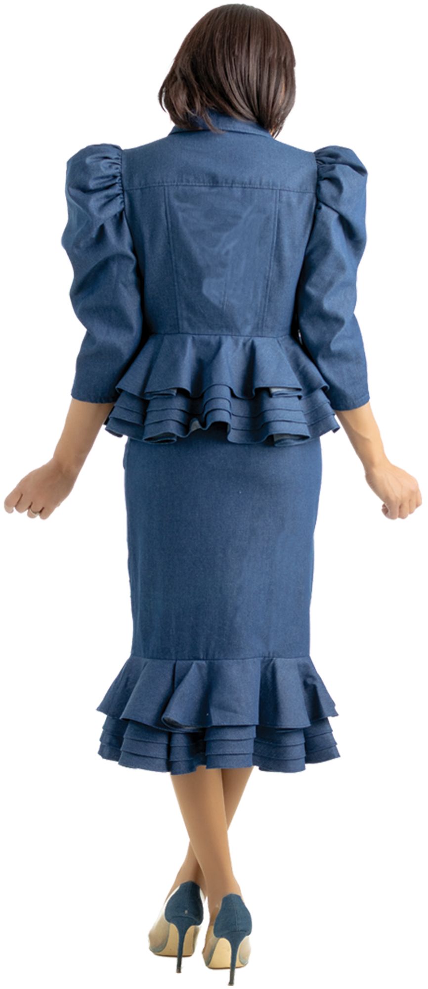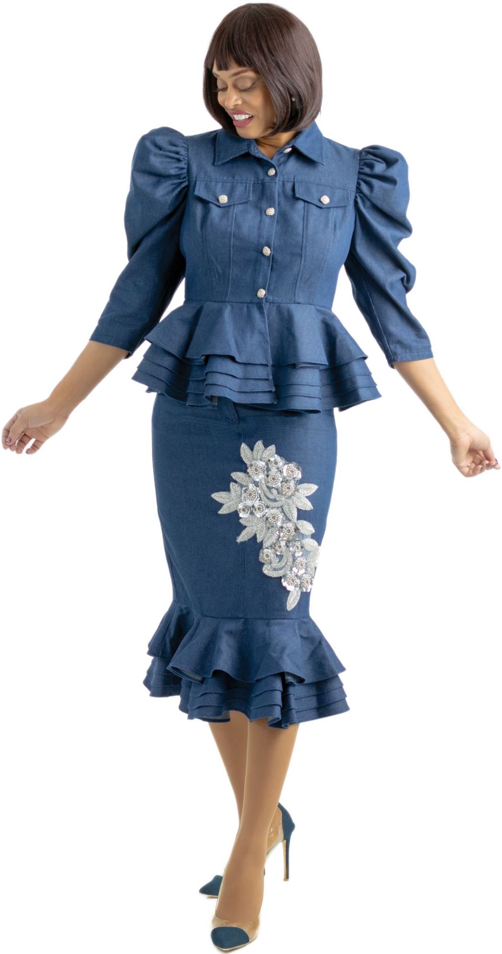 Light denim mermaid skirt set with peplum and flower embroidery