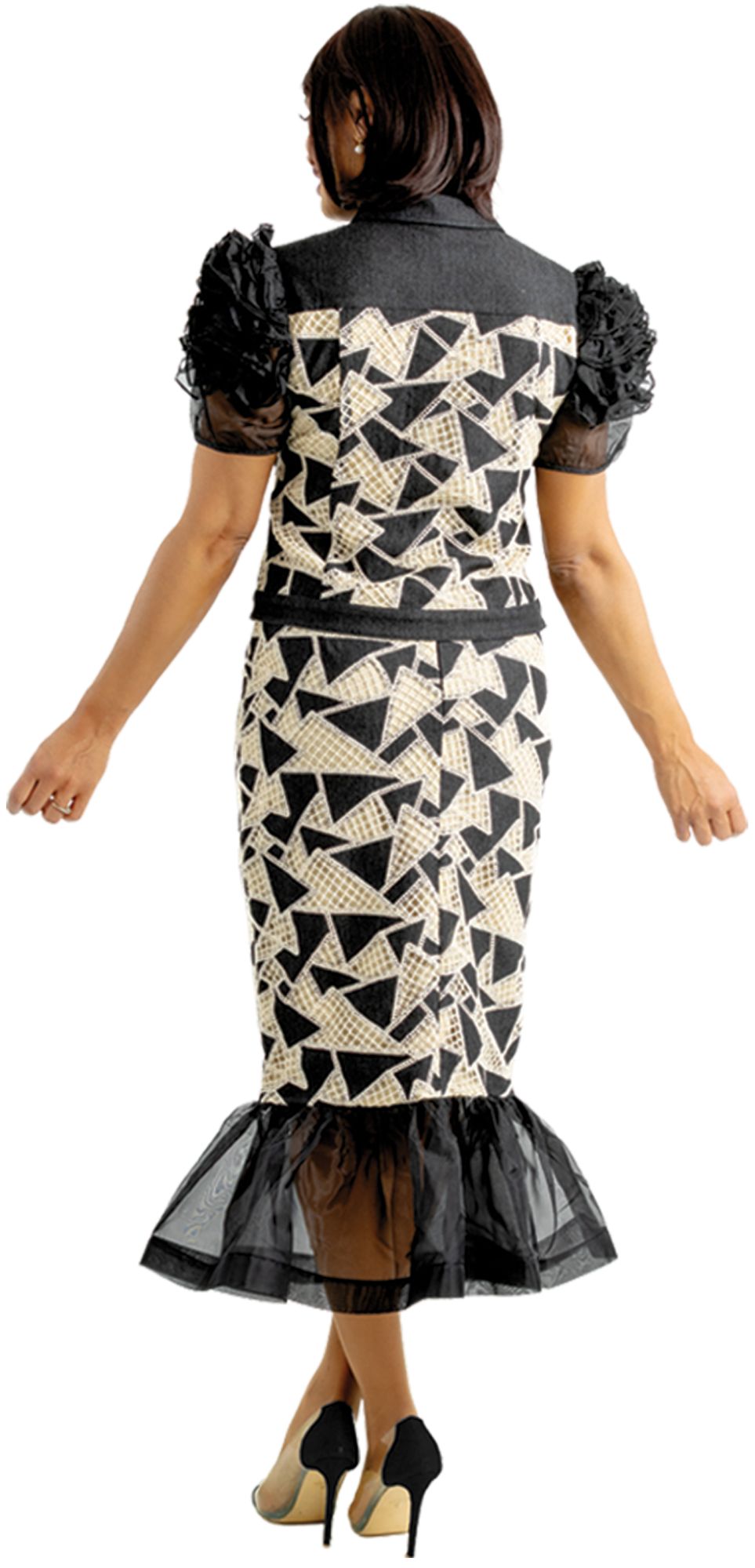 Embroidery pattern skirt set with organza ruffle hem and sleeves