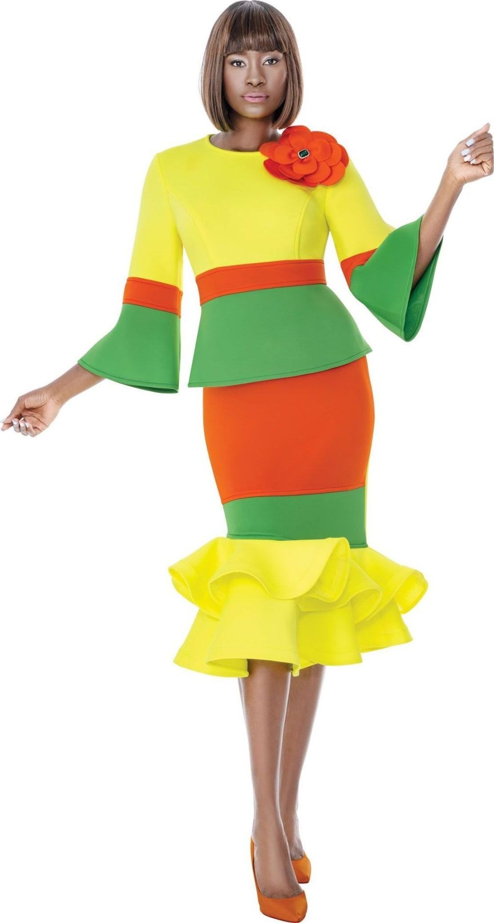 Description: 2 Piece Skirt Suit flower brooch & mermaid hem skirt