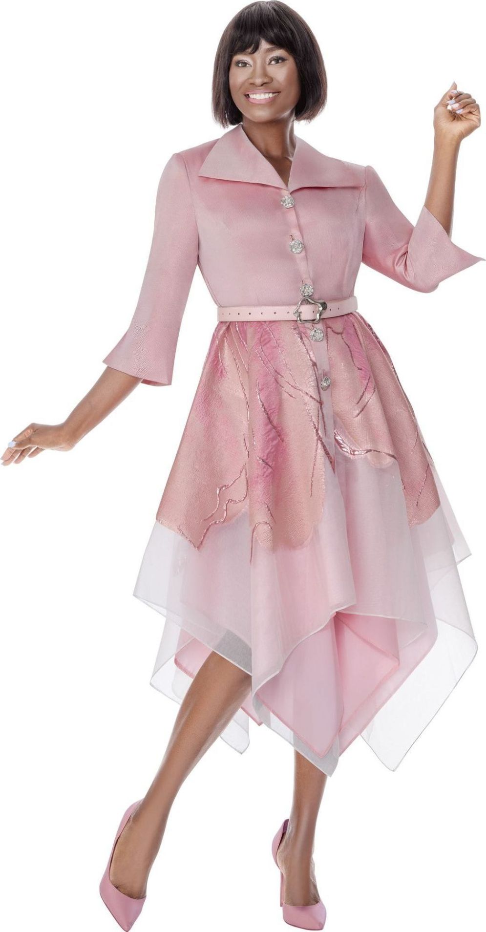 Description: 1 Piece Dress 3/4 sleeves & flat wide collar with a layered hankerchief hem & jeweled buttons