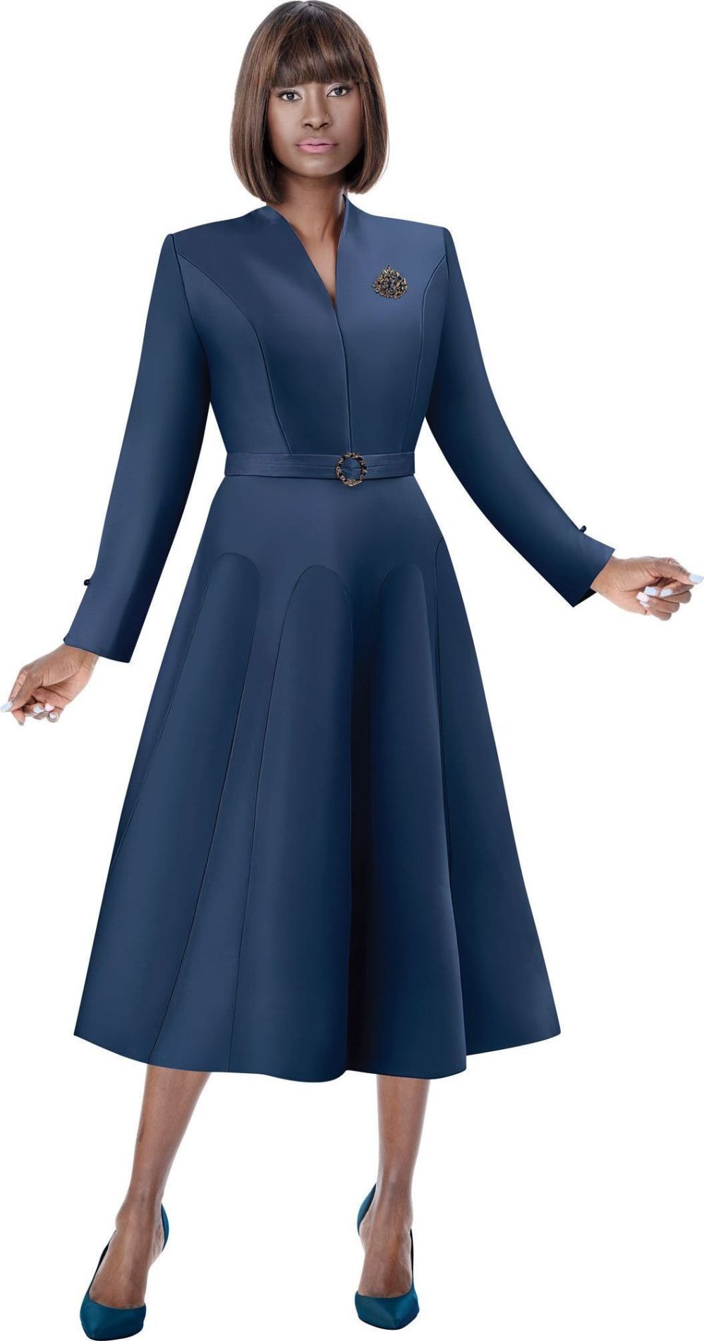 1 Piece Dress w/Belt with flared skirt, belt look & Rhinestone Brooch
