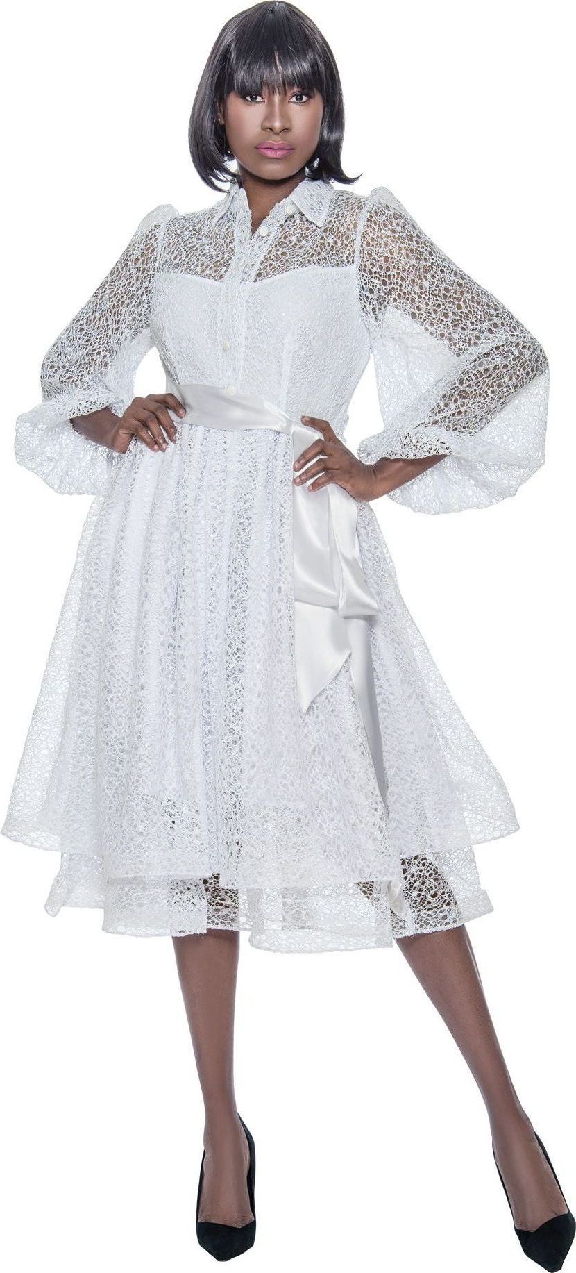 Description: 1 Piece Dress collared novelty lace dress with satin belt & button front with sheer shoulder & bishop sleeves & layered hem