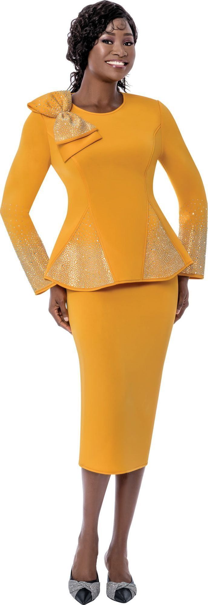 Description: 2 Piece Skirt Suit in Scuba fabric with Bow Accent & Rhinestones in Peplum Style