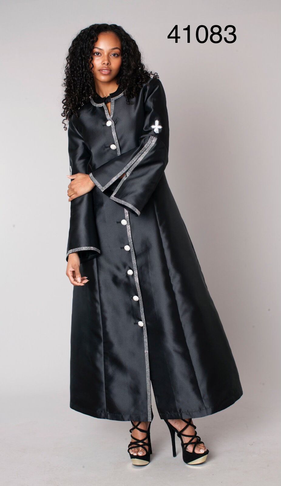Description: Rhinestone Trim Cross Clergy Robe Rhinestone Trim, Button-front Closure w/Embroidered Cross Sleeve Accents, Full-length A-line Silhouette & Flared Sleeves