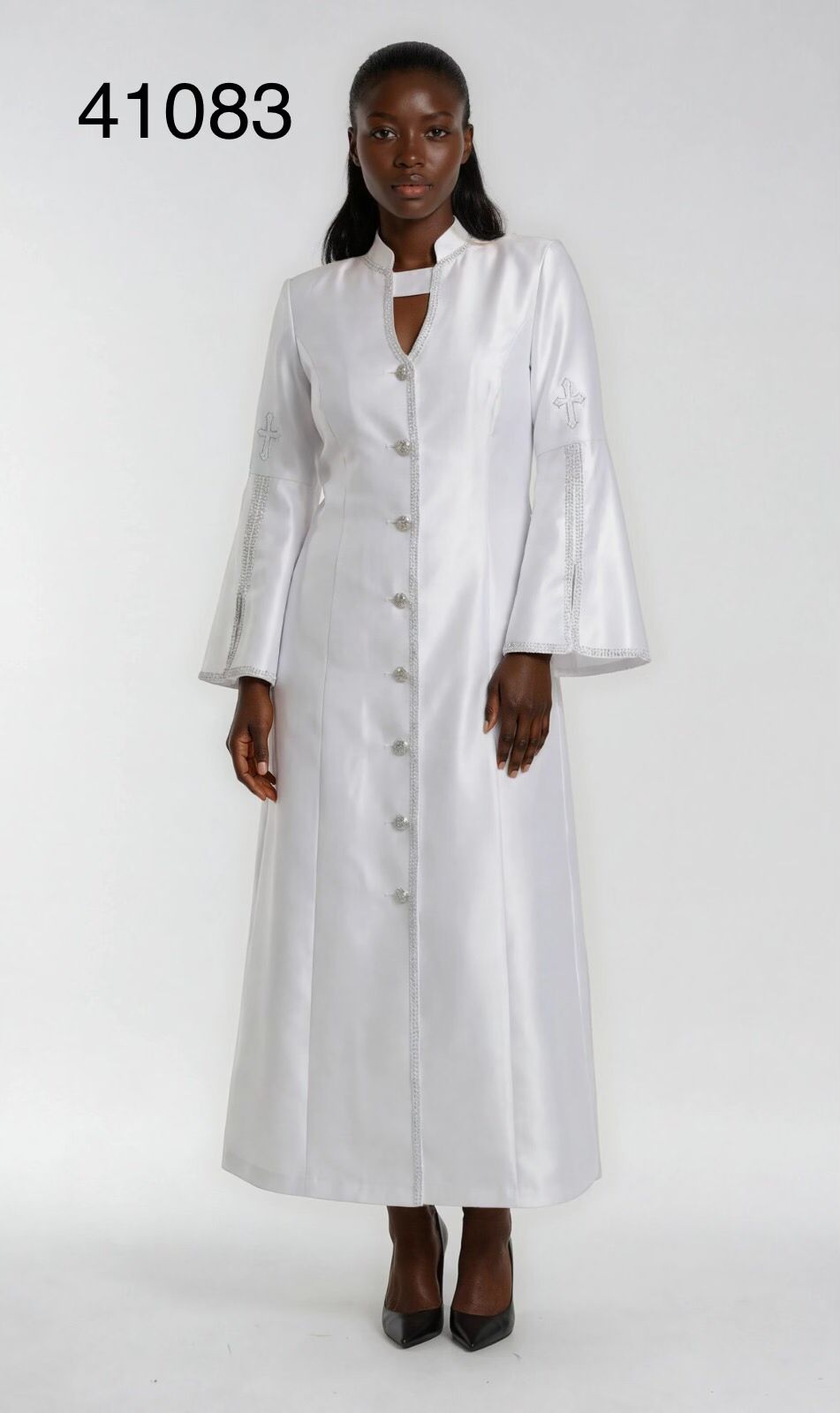 Description: Rhinestone Trim Cross Clergy Robe Rhinestone Trim, Button-front Closure w/Embroidered Cross Sleeve Accents, Full-length A-line Silhouette & Flared Sleeves