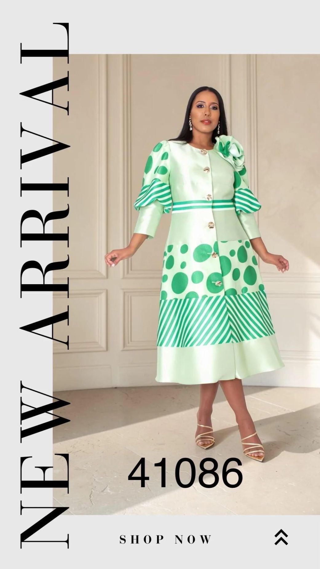Description: Polka Dot Stripe Bow Detail Midi Dress w/Shoulder Bow, Button-front Design & Flared Hem